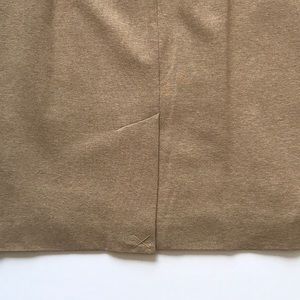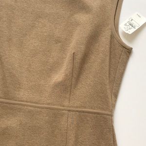 Beautiful tan stretchy jersey sheath dress, knee length, sleeveless, hidden back zip closure.