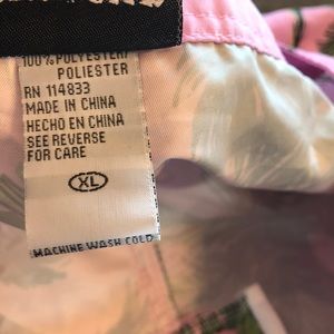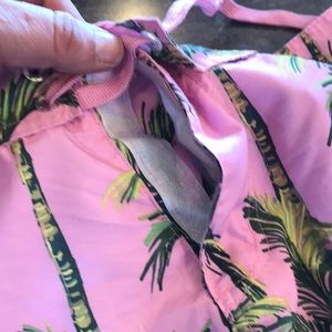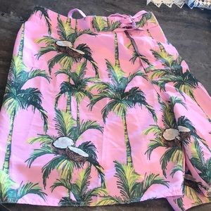 Size xl. Waist: 38” Inseam 7” length 17-18” lined inside. Side cargo pocket. Pink with green palm trees and coconuts.