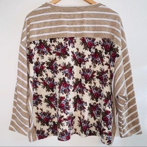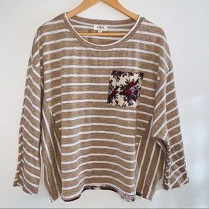 Umgee tan and cream striped oversized top with a floral left breast pocket and back. Lightweight knit fabric. Pit to pit 29” Length 24.5” Pit to bottom hem 12.5” Pit to cuff 12.5” (All measurements are approximate since the armpits are curved. Excellent condition, no signs of wear or rips or stains.