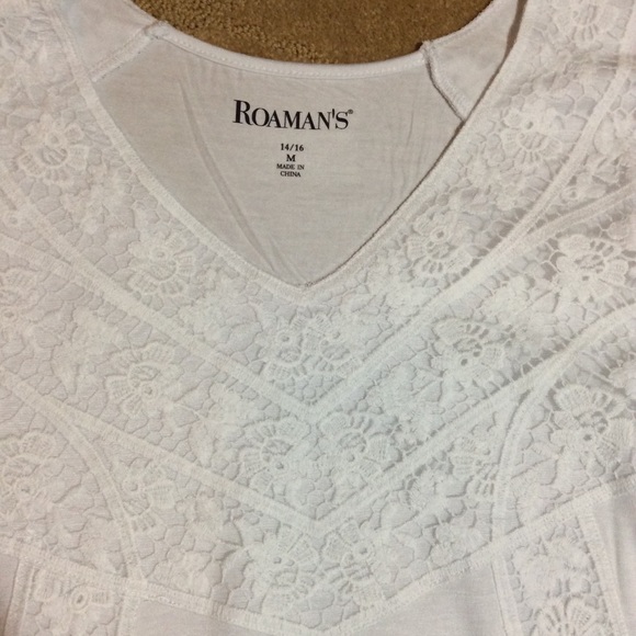 Roaman’s brand NWT Women’s Crochet Swing Tunic in White, size Women’s Medium 14/16. V-neckline with crochet accents. Figure-flattering tunic with a swing silhouette. High-Low hem, approx. 36” length at longest. Very soft, comfortable and versatile! Rayon/Spandex and machine wash. NWT