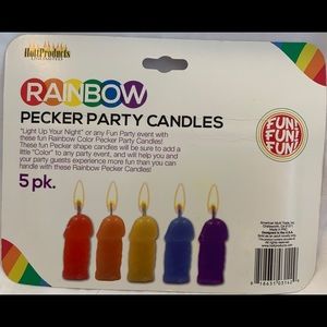 Setting the scene for an anything-but-boring night in, Hott's rainbow hued Pecker Party Candles will let off a cheeky glow wherever they're lit. Brighten up dull corner's of the party or make 'em a centerpiece of hilarity. No matter where you put the five included mini candles, please practice safety. Keep the wicks trimmed and place the candle(s) on a solid surface away from furniture, curtains, pets and otherwise.