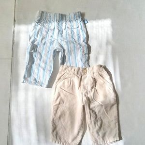 Lightweight, striped pair is 100% cotton and in like new condition, khakis are a linen/cotton blend with one faint mark as shown in last pic. Striped pair is cargo style with 4 functional snap close pockets. Khakis also have 4 functional pockets plus a faux button closure on waistband. Both are elastic waistband, size 3/6 months. Bundle with other items for discounts.