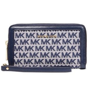 From MICHAEL Michael Kors, this Wallet features:soft jacquard45.7% linen, 34% cotton, 20.3% polyesterzip closure18k hardwareapprox. 7"W x 4"H x 1"D; handle drop 6"interior zip pocket, 1 slip pocket, 7 card pockets, 1 tech pocketfits up to iPhone 7+-8+weight approx. 0.49 lbsImported.