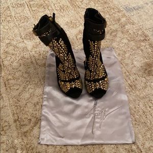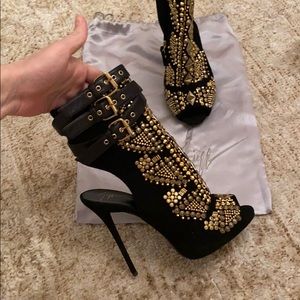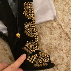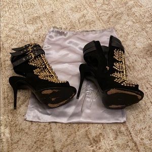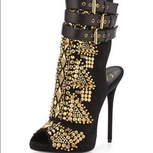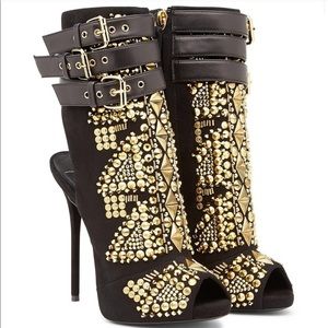 Giuseppe Zanotti allure lane boots size 8,5 . Good condition, bought in Saks NY. Very little damage could be easy to fix. Leather strap on top no scratch! Beautiful boots! Giuseppe Zanotti ankle bootie features suede and leather upper.5 covered heel; 1/2 platform; 4 1/2 equiv.Allover golden stud and rhinestone. Made in Italy