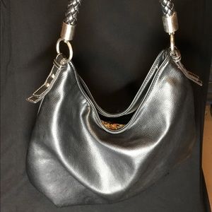 Large black hobo shoulder bag from Nine West. Braided strap, brushed nickel accents, and zipper closure. Two inside pockets and colorful print lining.