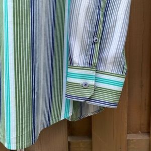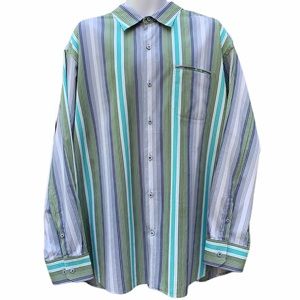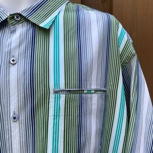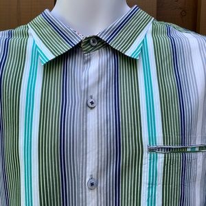 Tommy Bahama Striped Silk Blend Button Down Shirt. Spring time colors vertical stripes. Floral print inner collar and cuff details. Buttonless front pocket. 80% Cotton, 20% silk. Men’s size 2XB. In excellent pre-owned condition.