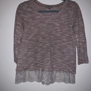 3/4 sleeve sweater with lace detail on bottom.