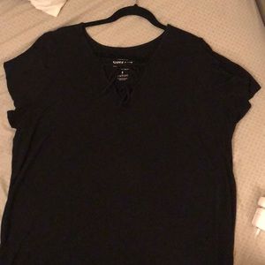 Fitted flattering black tee with front 3 tie detail, can easily be tucked in or wore out. Never worn new no tags.