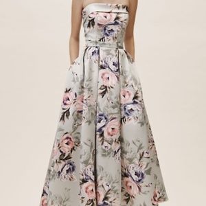 - Swathed in a gorgeous floral print, this strapless ballgown has a subtle high-low hem and pockets!