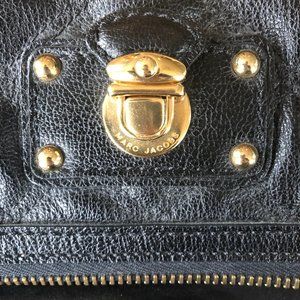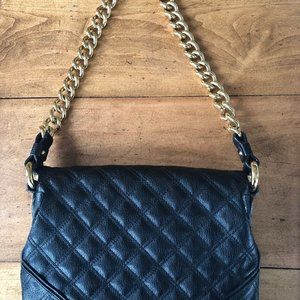 Authentic black leather Marc Jacobs shoulder bag with gold-tone hardware, chain-link shoulder strap, tonal quilted leather panels, single exterior zip pocket at front, signature push-lock placard at front, taupe woven lining, single interior zip pocket and zip closure at fold-over flap.