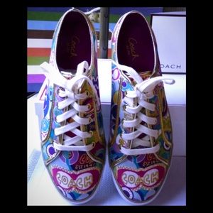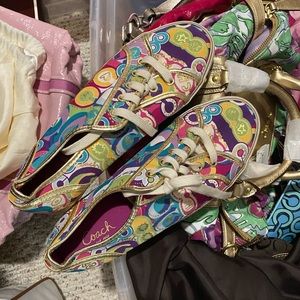 Coach brand new pop c size 9. These have not been worn but have been stored. Fabric is bright no issues. You can see they are not worn just been stored for sometime.