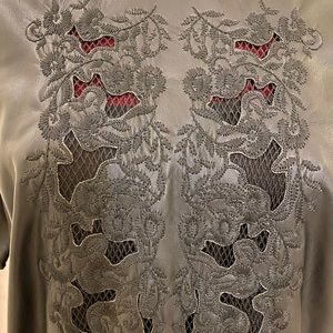 Faux leather dress with front embroidery and net accent. Size L, New with tags. Belt NOT included.