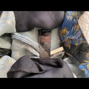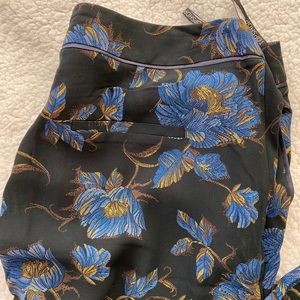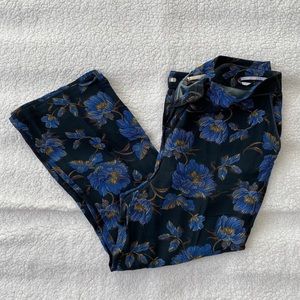Super cute blue, yellow and brown floral print trousers from Topshop. Satin trim along waist and at slant side pockets. Slightly cropped. One faux back pocket.
