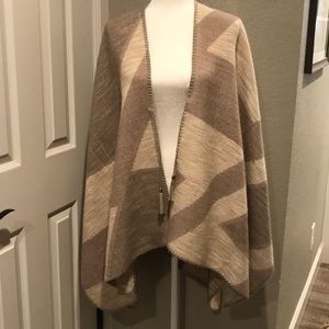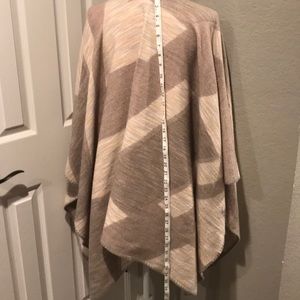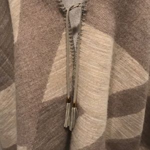 Just a gorgeous poncho with beautiful brown/tan pattern. Super soft and so cute on. Machine washable. 100% acrylic with a cute leather and gold bead tassel detail. Hangs longest at about 40”. One size.