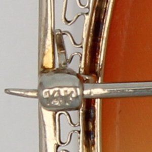 Vintage hand carved shell Habillé Cameo set in 14 Karat Gold. She is wearing a diamond necklace with one .10 Carat Diamond. This is a beautiful hand-carved piece of wearable art. The bezel has a detailed filigree pattern of 14k white gold. The brooch measures 1-15/16" from bottom to top and 1-1/2" from side to side. There is a hinged jump ring that will allow this to be worn on a necklace.