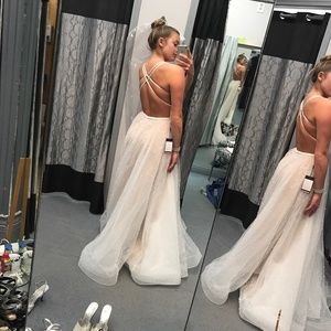White top with mesh in between the front panels, and thin straps that clasp in the back