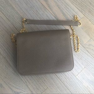 Used only once, in perfect condition. Color is a taupe/brown, gold tone chain with leather strap at shoulder, three internal zip compartments. Measurements width 8.75”, height 7”, depth (empty) just under 2”. Gorgeous bag, dust bag included.