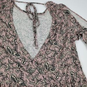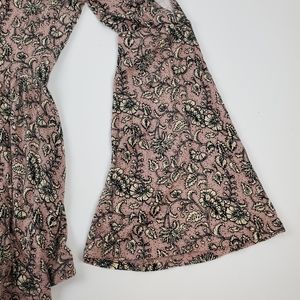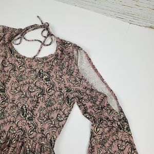 American Eagle Outfitters Soft & Sexy pink floral print cold shoulder top. Long bell sleeves. Wrap style back with tie at neckline in the back. Peplum style. 94% viscose 6% elastane. Size: M