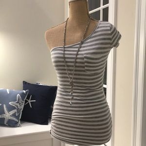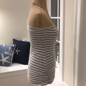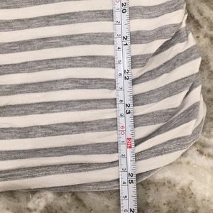 Grey and white striped top that’s fitted along the sides. Scrunched design 😍 Has a cute little pocket on the front. So many compliments on this one, just don’t wear it anymore. Measurement is from top of the shoulder to the bottom hem.