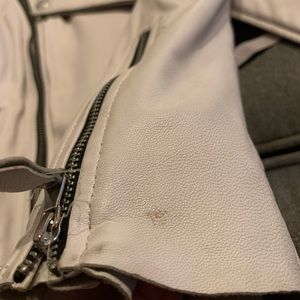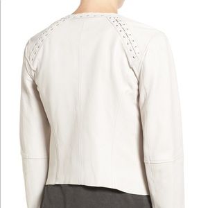 Zipper details and whipstitched trim add modern finesse and a bit of biker edge to a lambskin leather jacket. - Oversize lapels - Long sleeves - Front zip closure - Lambskin leather construction - Zipper detail - 2 front zipper welt pockets - Lined - Approx. 21" length - Imported