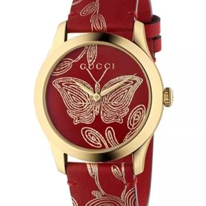 Gucci Swiss Red Hibiscus Leather Strap Watch