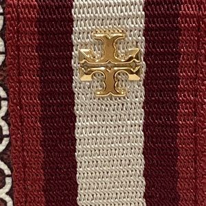 Tory Burch Gemini Link Canvas Wristlet, NWT, Royal Burgundy, Will hold a iPhone 11 or Samsung Galaxy Note 10+, Water-resistant, zipper closure, Wrist strap, 1 interior card slot; approximate measurements: height 4.2", length 7.2"; This bag is not Red; it is Royal Burgundy which is not a color choice in this application