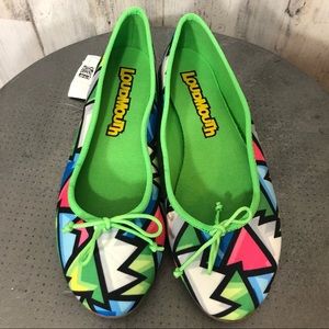 Loudmouth Crystal Bella Style Neon Geometric Shapes Flats Shoes in the colors of White, Green, Pink, Blue, and Yellow. NWT no box. (Youth 5M size but fits like a women’s size 7/7.5) No flaws, but there is a price wrote on bottoms. Should be able to get off fairly easily. There may be a tiny pin prick where tag is currently.