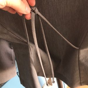 Gray suit jacket with front clasp & draw string in back.