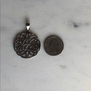 Vintage stamped .925 silver Celtic knot medallion with jump ring so you can put on your own chain or necklace. Because this piece is old and looks to be handmade I’m not sure if the curves are intentional. In other words, it doesn’t lay perfectly flat. Beautiful nonetheless.