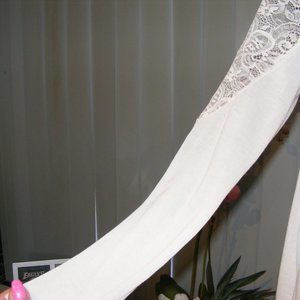 Lace is on upper top of sleeves and the top on the front and back.Beautiful lace details with hi low feature.This is an older top but in great condition.Just doesnt fit anymore.Polyester/Hand wash/Stretchy Material Measurements arePit to Pit 18"/ sleeve Length is 23" /Shortest Length is 18" / Longest Length is 29"White top goes with any outfit.