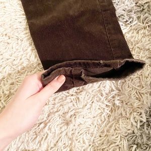 Skinny corduroy chocolate brown color size 00. Excellent condition. Distressing at pockets, ankles, fly are all intentional please see photos.