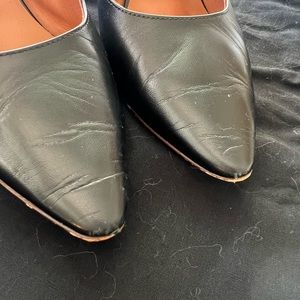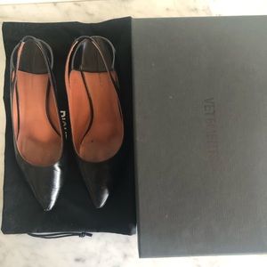 The stunning and wildly practical Vetements Babouche slingback has an artfully presser heel for a slip on effect. Super chic! Preloved condition with lots of life left, but could benefit from a polish at the cobbler.