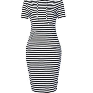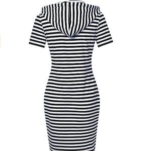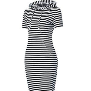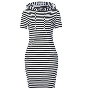 POP ELEMENTS -- Short Sleeve Keen Length Pullover Stripe Hoodie Dress with Kangaroo Pocket.