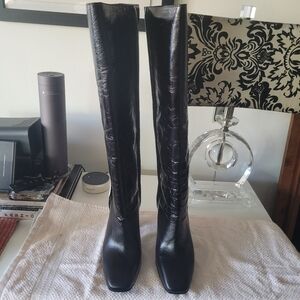 Brand new in box black leather crumbled knee boots with white piping. Blocked heel, square toe, pull on, leather sole. Fits true to size. Comes in original box with dust bag.