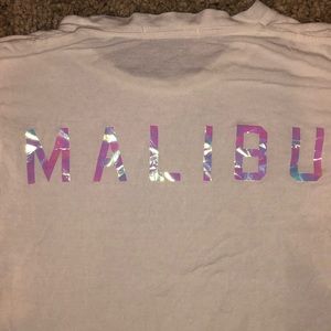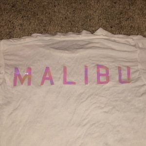 Cute BRANDY MELVILLE White Malibu T-Shirt. Plain front and lettering in the back. Lettering is in a reflective iridescent/reflective material.