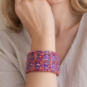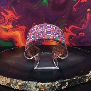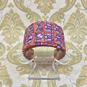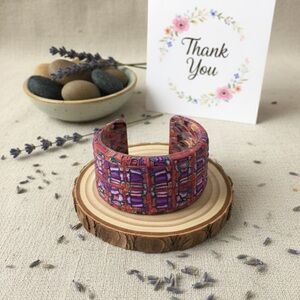 Elevate your accessory game with this stunning, one-of-a-kind handcrafted cuff bracelet. Featuring a vibrant, intricate geometric pattern in shades of royal purple, magenta, and turquoise, this piece is a true work of wearable art.