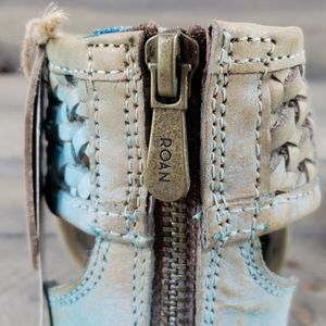 New in box. Women's 7W. Boho Blue/Taupe. Hand Woven Leather upper . Cushioned footbed. Back zipper closure for easy on and off. Flexible Outsole. Leather lining. Smoke and pet free home. Packaged carefully and fast ship
