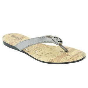A metallic logo medallion gleams from the thong strap of a cushy flip-flop she'll want to wear with everything.