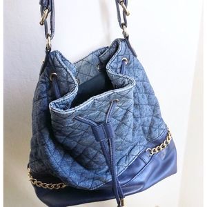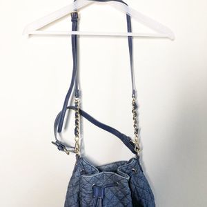 Tommy Hilfiger Blue Quilted Bucket Bag with drawstring and detachable shoulder strap with gold chains. Has a faded blue look. In great condition.
