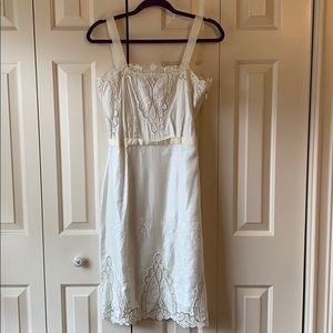 White eyelet dress with ribbon strap and around waist. The ribbon isn’t secured at the top of the waist to allow for a fit. Never worn but bought years ago—I’m petite and the straps were just a little too long for me. Open to offers!