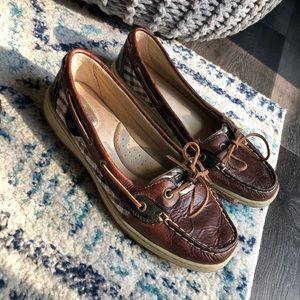 Size 9.5 cute brown Sperry Top Siders with a brown and white checkered pattern on the sides. Worn once or twice! Perfect for Spring!