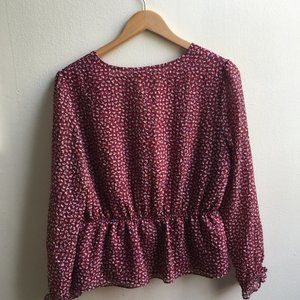 In excellent condition! Perfect spring top. Has a cute peplum bottom and button up the front. 100% polyester. Machine wash cold and tumble dry on low.