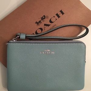 Coach corner zip wristlet in Steel Blue.