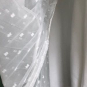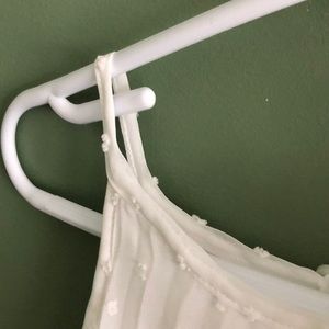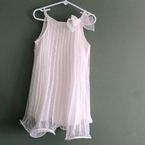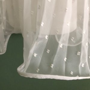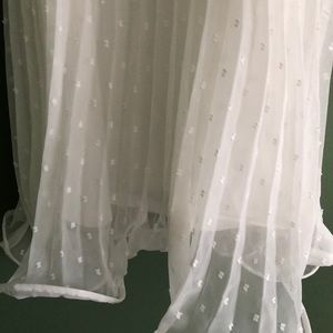 Outer sheer fabric with small imprints all over the dress. Outer side curls on the bottom for a great effect. Spaghetti straps on the shoulders. Very cute.