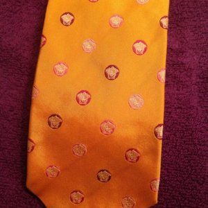 Like New - This item may have been worn but has no visible signs of wear. An extremely nice preowned Versace necktie. Deep yellow in color with multi colored signature logos. Pure silk and excellent condition. 3 1/2'W-58'L. A compliment to any suit, shirt or blazer.