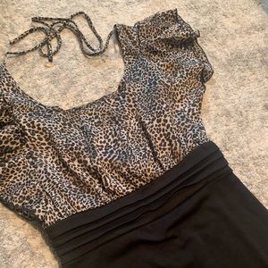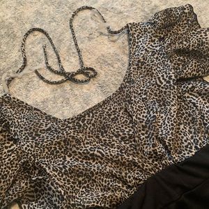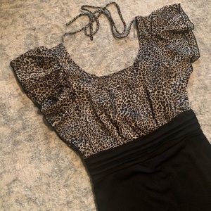 Half leopard, half black dress. Crew neck front, v neck back. Strap tie at the back of the back. Ruffled sleeves. Ruffled trim at the waist.
