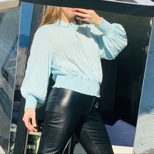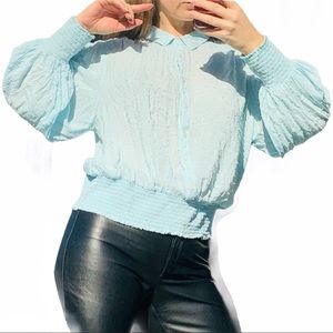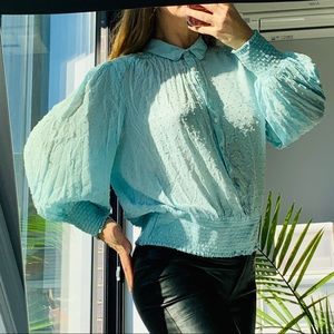Anthropologie Maeve Turquoise Teal Puff sleeves Sky Blue Blouse air like fluffy puffy polka dot Jacquard textured breathy bring your best Pirates’ Captain self out! World gets better when Girls rule! So romantic and chic works as office attire or party night day out