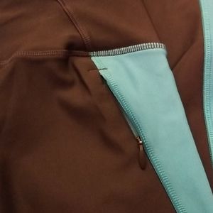 Zippers on bottom of legs and small zippered pocket on back. Drawstring inside which actually works!