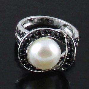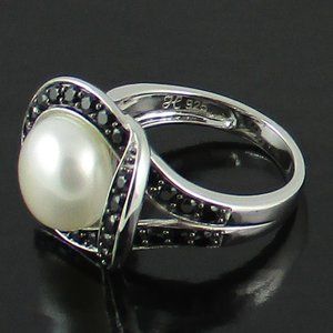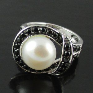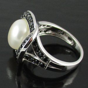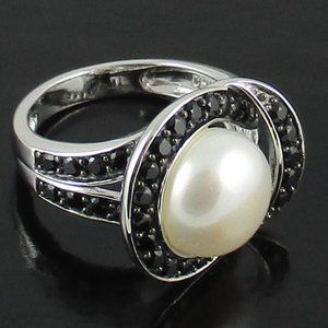 Honora White Cultured Pearl 11.0mm and Black Spinel Sterling Silver Ring. Button-shaped, white cultured freshwater pearl between overlapping layers of sterling silver set with pave' black spinel; black rhodium accents black spinel setting; split shank with pave', round black spinel.