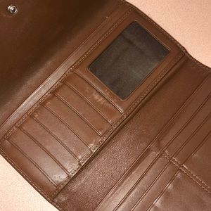 Excellent used condition - Tri-fold snap wallet/clutch. Brown and gold cloth logo exterior with brown leather lining and interior. Opens up for 16 card slots + 3 long slots for bills. Zippered coin pouch storage in the back. Slight wear MOSTLY INSIDE on leather.